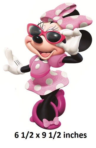 - Minnie is sporting sunglasses in her pink polka dot dress!