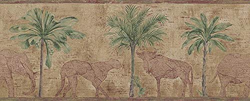 Village Wall Border 5804451 Palm Trees African Animals Wallpaper Elephant Leopard Wildebeest Map Silhouette Burgundy Green on Warm Earth Tones Home Decor