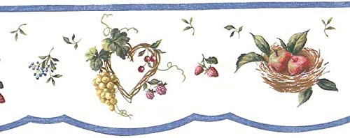 Waverly Wall Border 5505673 Scalloped Fruit Toss Kitchen Wallpaper Grapes Apples Strawberries Blueberries Hearts Baskets Blue on White Country KitchenHome Decor